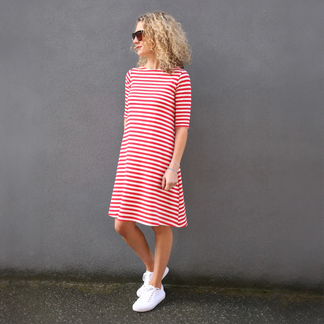 The Frankie Top/Dress is the perfect jersey knit style and a fabulous wardrobe winner across all the seasons.The pattern features a boat neckline, flared hemline, set in sleeves and comes with numerous style options - two dress lengths, a top and three sleeve lengths (elbow, three quarter and full). The stitched down, back facing creates a neat and secure neckline.Ā