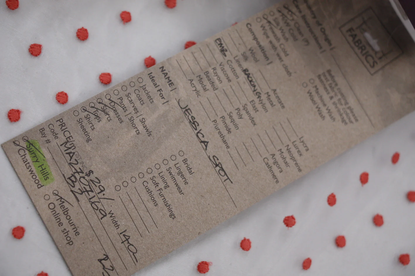 Designer white/red 50% cotton embroidery 50% nylon organza base. Width:140cm