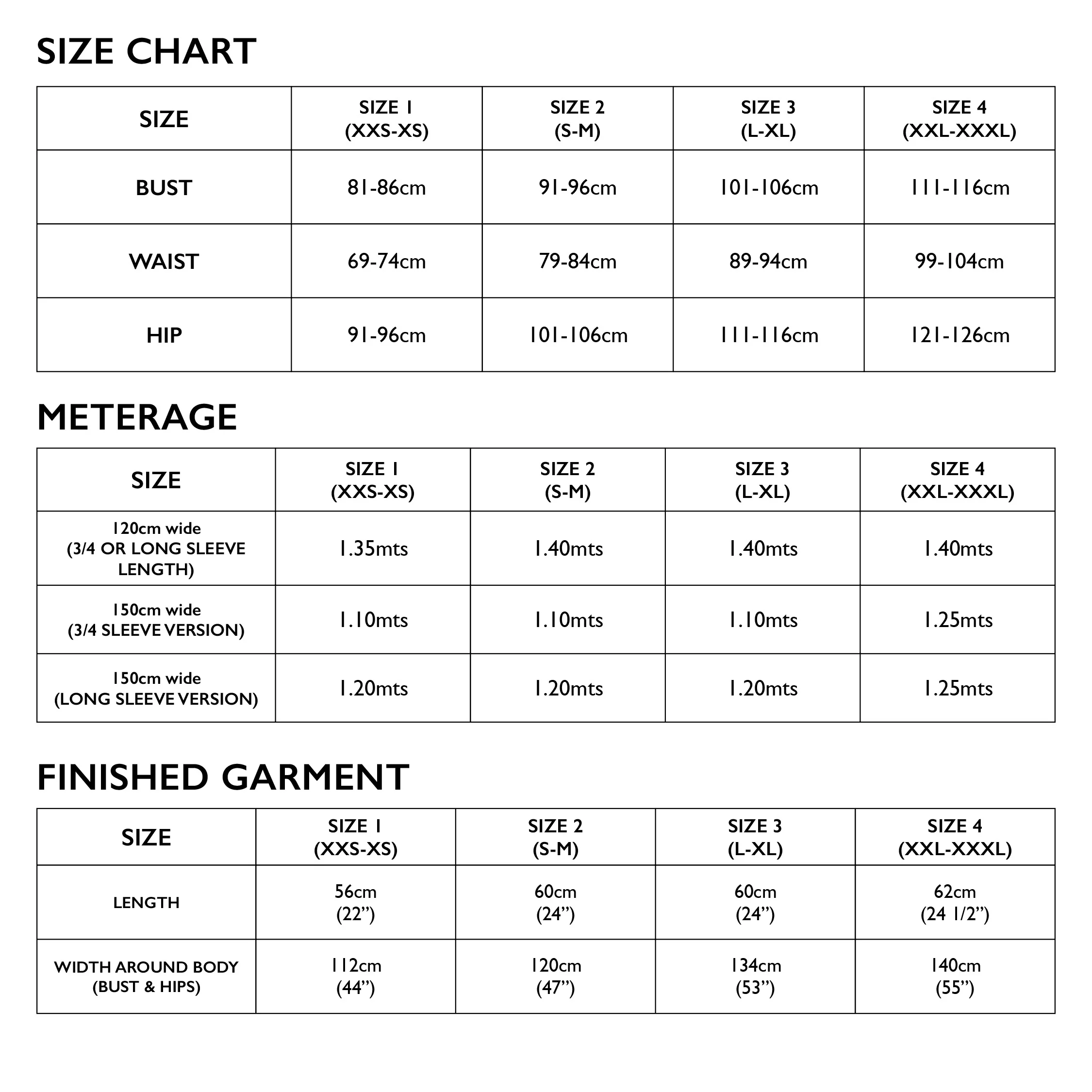 Meterage/Finished measurements: refer table in images