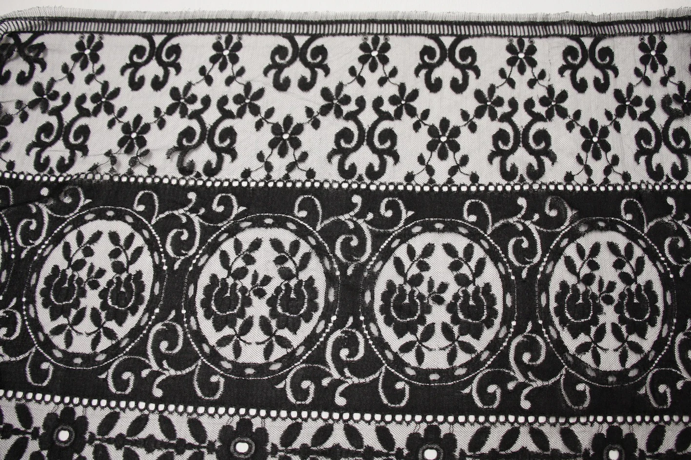 French designer black 79% rayon 21% nylon lace.