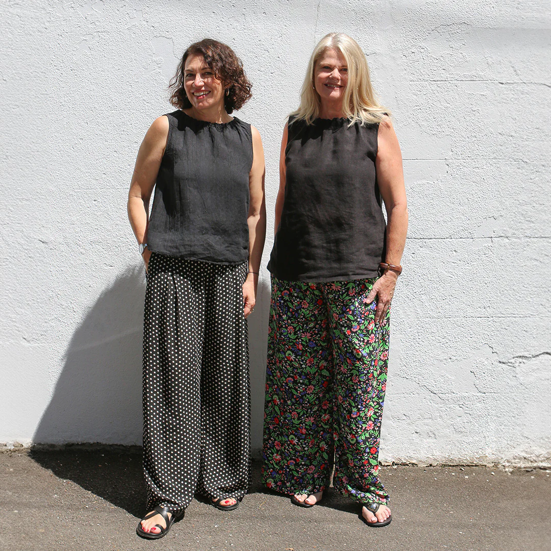TheĀ Sammy Pants Pattern is a pull-on, full-length palazzo style designed for drapey, woven fabrics. Partially stitched-down inverted pleats control the volume and keep them sleek from waist to hip. They also feature slanted side pockets with topstitched, curved openings and topstitched hems. These wide-legged, flared pants are easy to sew and wear when you feel like dialling up drama or catching a cooling breeze on a hot day.