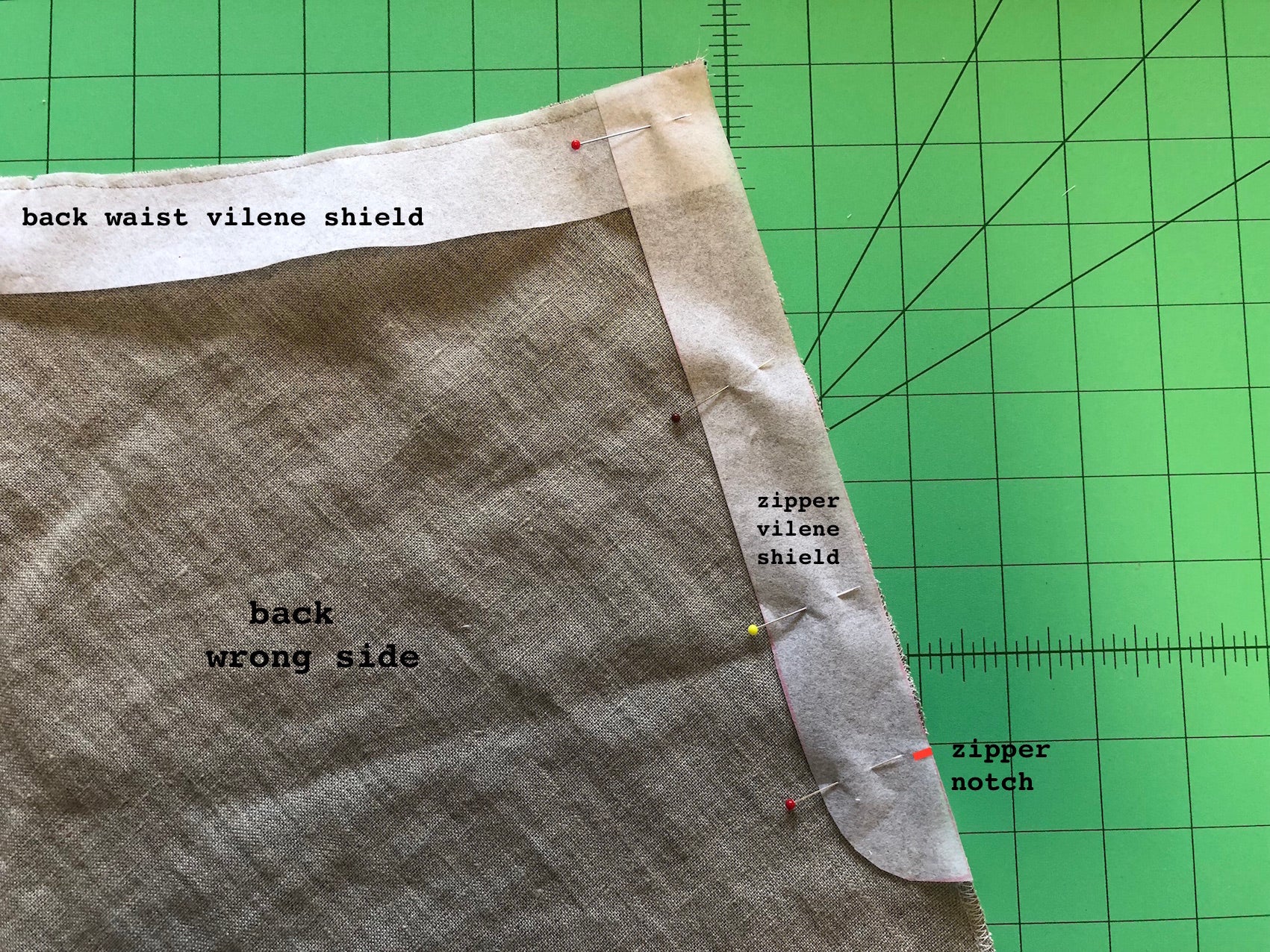 Pin the shield to the fabric (generally to the wrong side) using only 2 or 3 pins, making sure that the edge (at neckline, armhole, waistline etc) of fabric exactly fits the edge of Vilene shield. Sew the shield to fabric within the seam allowance. Sew the facing or binding seams before tearing away the shield.
