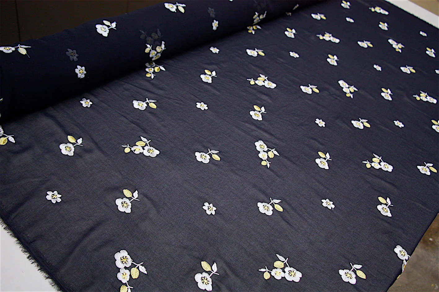Navy 100% polyester georgette with white/yellow embroidered floral